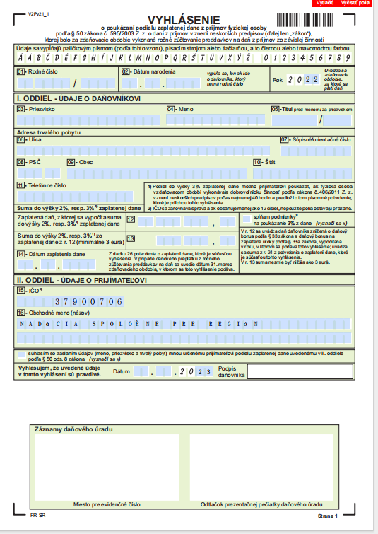 - 2% darujte Nadácii spoločne pre región, potvrdené tlačivo – Potvrdenie o zaplatení dane z príjmov doručte do MŠ Jasenica a následne vypíšte tlačivo Vyhlásenie o poukázaní podielu …